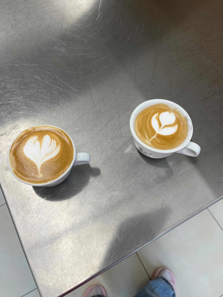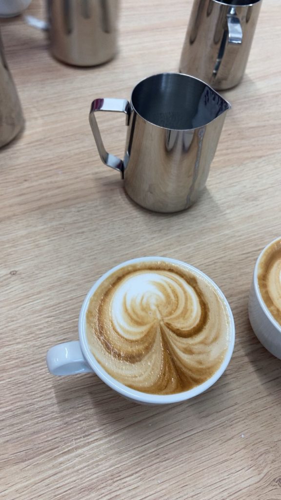 Druhý deň sme sa zoznámili so základnými druhmi kávy ☕ a speňovaním mlieka 🥛. Zo začiatku to nešlo úplne všetkým, ale na konci dňa sme už vedeli pekne speniť mlieko.